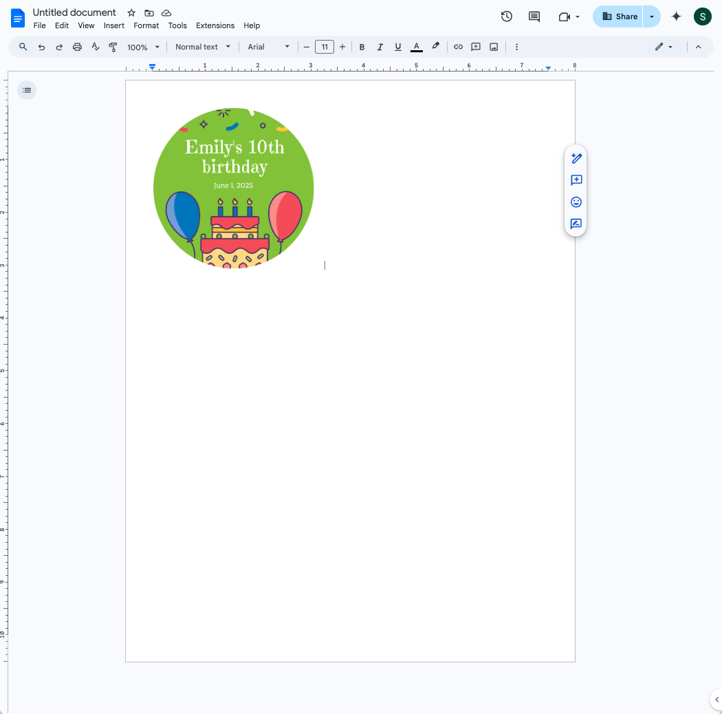 Fai clic sull'immagine e trascina gli angoli per ridimensionarla. È possibile utilizzare i righelli sullo schermo per approssimare le dimensioni. le dimensioni più comuni degli adesivi sono 50 mm × 50 mm e 75 mm × 75 mm. Se lo ritieni necessario, stampa una copia di prova per vedere se le dimensioni sono di tuo gradimento. !